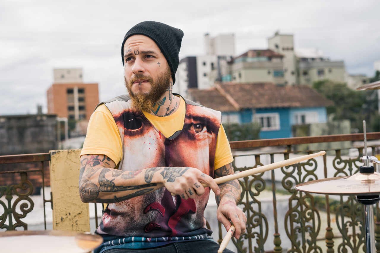 “É aí que penso se vai ter piano, violino, sintetizador ou outro efeito. Tudo que vai ser feito, eu crio primeiro no violão. Chegando no estúdio para gravar, eu chego com 95% da música pronta. Aí eu gravo um esboço da bateria lá e gravando as demais composições. Às vezes peço ajuda ao meu produtor na produção da linha de baixo, já que ele é baixista”, conta.