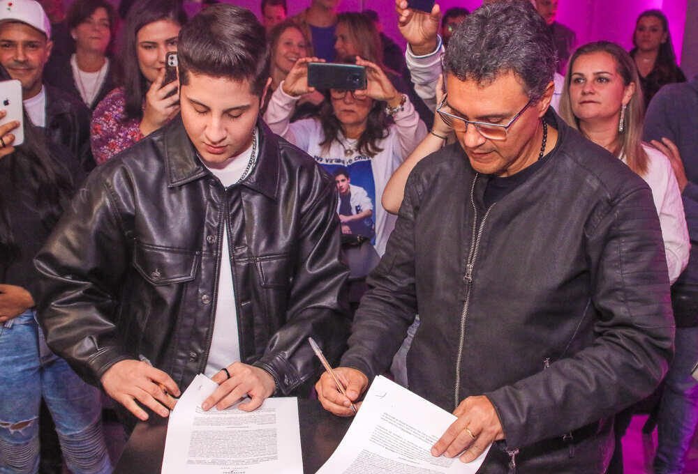 contrato entre o artista e a companhia, que contou com a presença de Paulo Lima, presidente da Universal Music Brasil, Claudio Vargas e Daniel Rigon, vice-presidente e gerente de A&R da companhia, respectivamente, e parte da companhia, além de Hugo e seus empresários, Leco Geisler e Vania Barbosa, seu irmão, Felipe de Paula, toda sua equipe e muitos fãs.