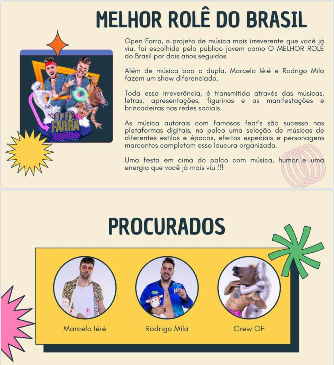 O Open Farra surgiu com a ideia de ser o projeto mais irreverente do Brasil. Composto pelo duo de DJs mais carismático da atualidade, Marcelo Ié Ié e Rodrigo Mila, a proposta era criar um grupo musical que misturasse várias vertentes em uma mesma apresentação: DJs, MCs, músicas autorais, performances, personagens, efeitos visuais e muita energia!